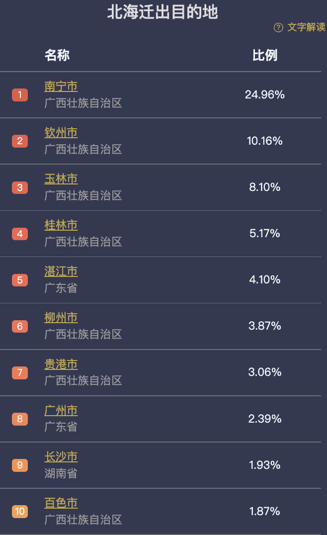 根据百度地图迁徙大数据,北海流出的人口中,除了流向自治区首府外,也有不少流入到周边城市以及东部的广东。
