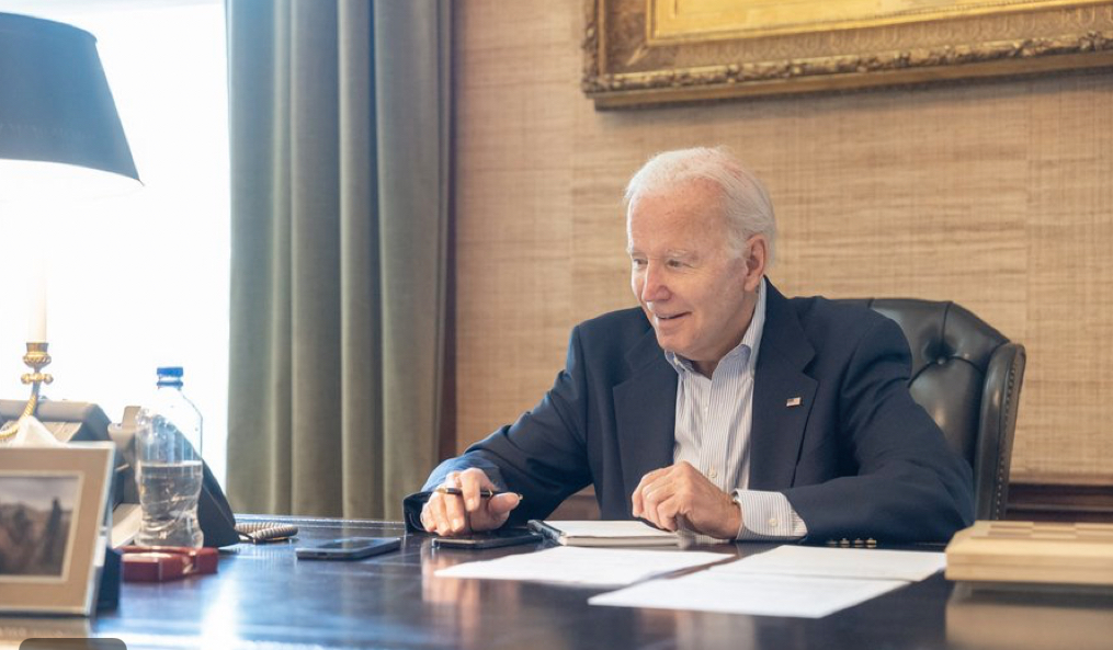 在另一张最新发布的照片中,拜登微笑着,身穿西装外套,坐在办公桌前,手里拿着文件。