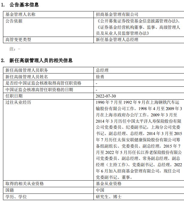 7月29日晚间,招商基金发布一则人事变动公告,公司总经理一职由徐勇担任,任职日期为2022年7月30日。公司在7月21日召开的董事会上已决议通过该事宜。而此前该职位是由公司董事长王小青代为履行职务。