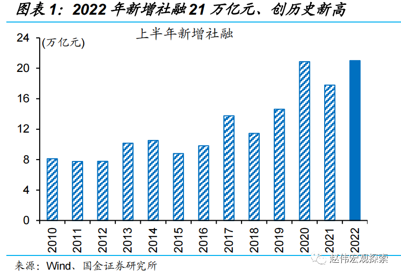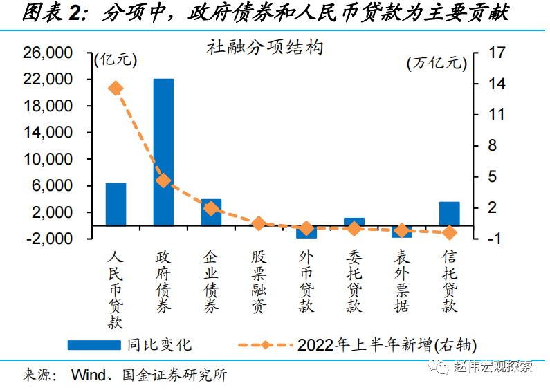 上半年新增社融创新高,政府债券贡献同比增量6成以上,人民币贷款也相对较多,其他分项变化不大。2022年上半年新增社融21万亿元、同比多增3.2万亿元,其中,政府债券融资4.7万亿元,同比多增2.2万亿元、占社融同比增量的66%;新增人民币贷款合计13.6万亿元、同比增量超6300亿元;企业债券同比新增近3900亿元至1.95万亿元;股票融资、非标融资新增绝对规模在0.6万亿元以内、同比变化相对较小。