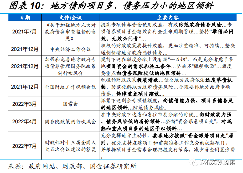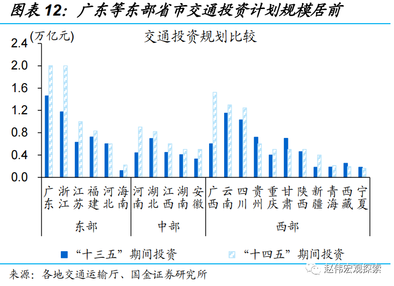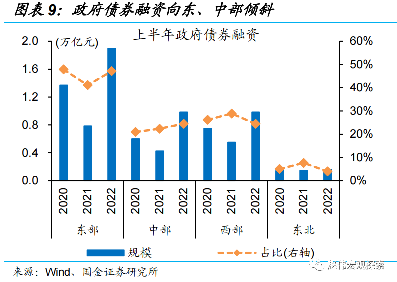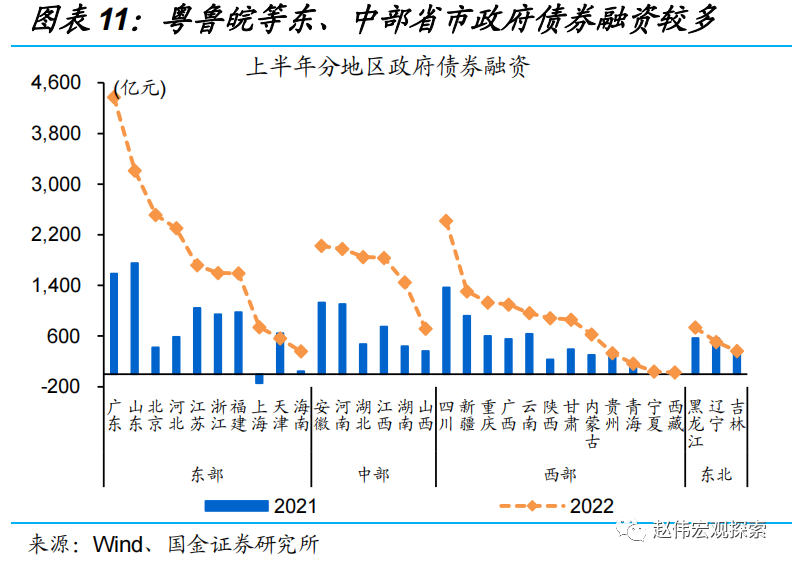 分地区来看,政府债券融资进一步向东、中部倾斜,尤其是粤京鄂等地,或与储备项目较多、债务压力相对较小等有关。上半年政府债券融资分布中,东部占比47.1%、同比上升6个百分点,中部地区占比小幅上升2.1个百分点至24.5%,西部和东北占比回落分别至24.4%和4%。其中,东部广东、江苏等地政府债券融资居前,中部河南、湖北等地也相对较多,与之一致的是,对应省市的项目投资规模也居前列,例如,广东、浙江“十四五”期间交通投资规划均超2万亿元、较“十三五”期间增长35%以上。