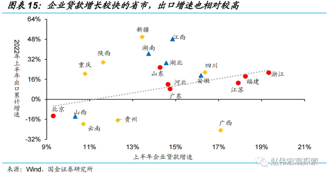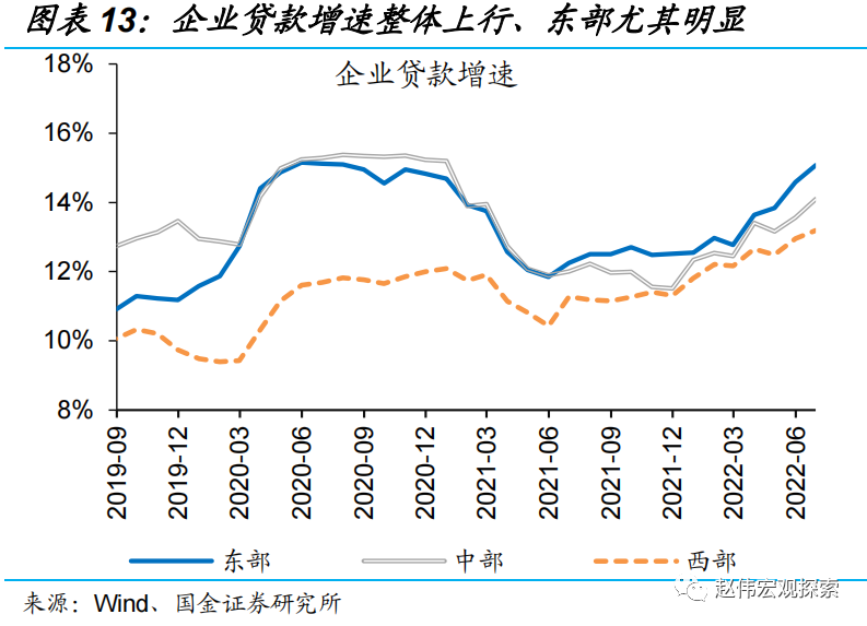 企业贷款增速整体上行、尤其是东部江浙等沿海省市,或缘于外贸链韧性较强等,皖湘等中西省市增速也高于区域平均水平。分地区来看,东部企业贷款增速斜率二季度以来进一步抬升,6月同比达15.1%、高于中部的14.1%和西部的13.2%。其中,东部的江苏、浙江等地,及安徽、四川、广西等地企业贷款增速明显高于区域均值2个百分点以上,或与部分省市出口韧性较强、政策性银行贷款释放的结构性支持等因素有关。