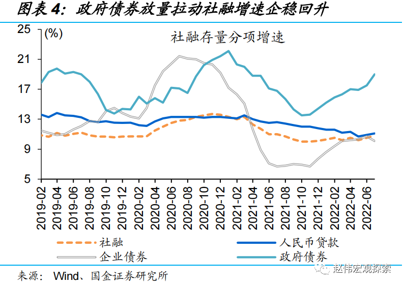 地方债发行前置等带动政府债券同比大幅攀升,成为拉动社融增速回升的主要牵引力。“稳增长”压力下,地方债发行明显加快、尤其是5月以来,地方债新券发行规模占新增额度比重由4月的40%大幅抬升至7月的95%,带动政府债券存量增速由16.9%、攀升至19%,成为社融增速企稳回升的主要贡献项。