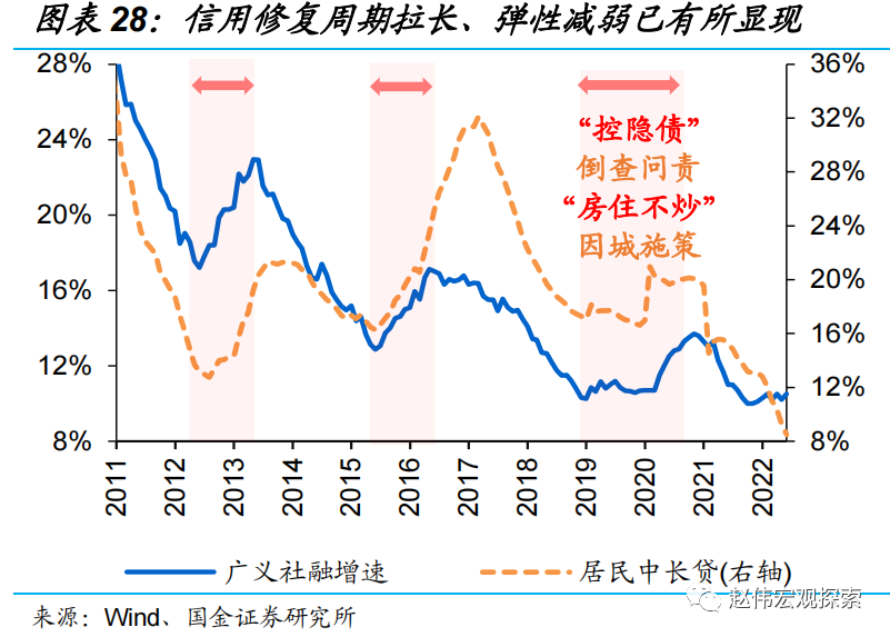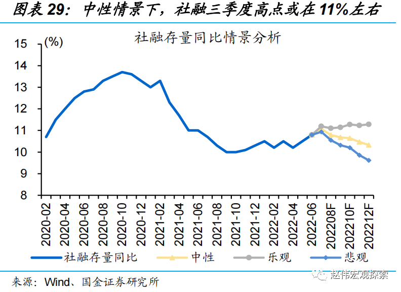 有别于传统周期,政策托底不走老路,防风险和债务压制,叠加微观主体报表修复难度或加大等,或使得本轮信用修复幅度弱于以往;事实上,第三轮信用修复就已经体现出信用修复拉长的特征。中性情景下,社融存量增速或于三季度达到高点、近11%,然后逐步回落至年底的10.3%左右。