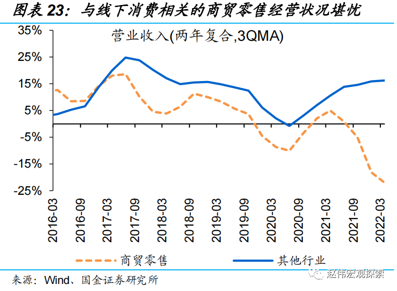 企业资产负债表经历了上一轮的疫后“爬坑”,增长动能或趋弱、5月工业企业亏损额累积同比仍高达50%,部分与线下接触消费相关行业在疫情反复影响下更是堪忧、一季度营收增速进一步下探至-30%以上。