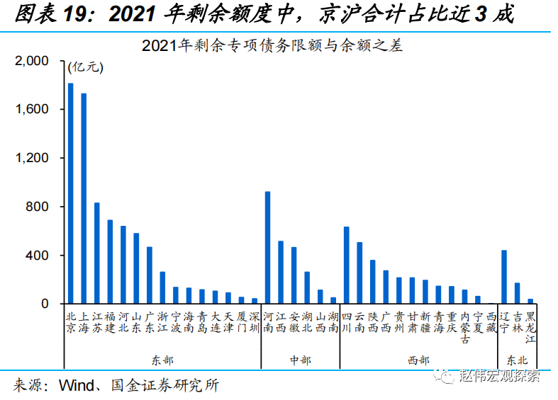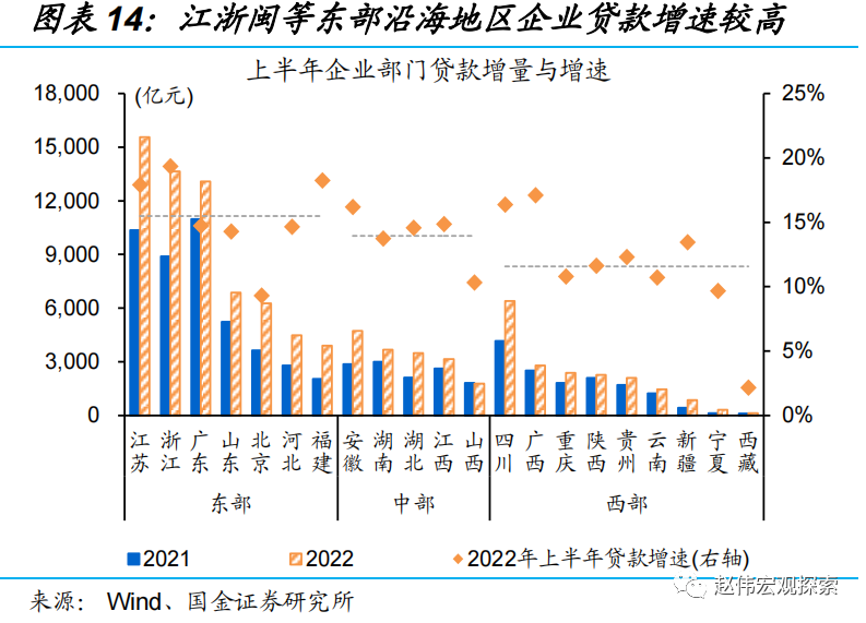 (2)分地区来看,政府债券融资进一步向东、中部倾斜,尤其是粤京鄂等地,或与储备项目较多、债务压力相对较小等有关。企业贷款增速整体上行,尤其东部沿海省市,居民贷款整体回落、西部拖累明显。