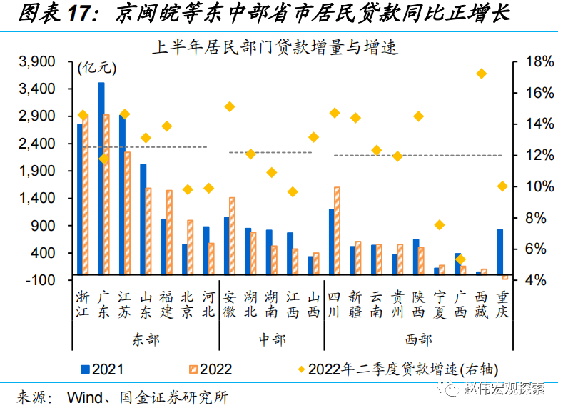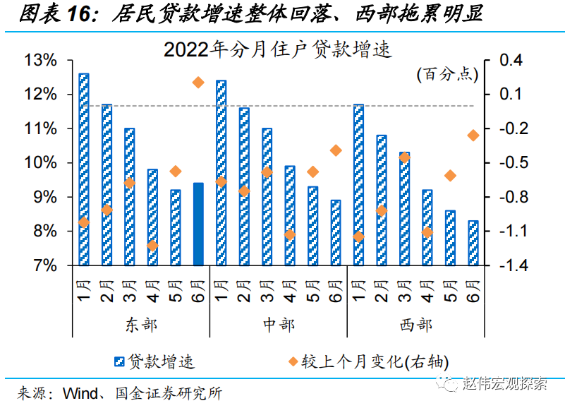 居民贷款整体回落、西部拖累明显,尤其是宁渝等地,中部降幅放缓、主因皖晋等地支撑,东部年中居民贷款增速企稳回升、京浙等地贡献明显。居民贷款分地区来看,中西部延续下行、降幅收窄,6月分别较上个月回落0.4和0.3个百分点至8.9%和8.3%,东部居民贷款年中企稳、较上月回升0.2个百分点至9.4%。
