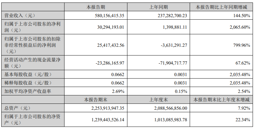 超频三8月26日晚间披露半年度报告,公司2022年半年度实现营业收入为5.8亿元,同比增长144.50%;归母净利润3029.42万元,同比增长2065.60%;基本每股收益0.07元。