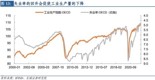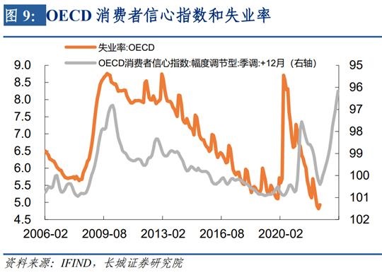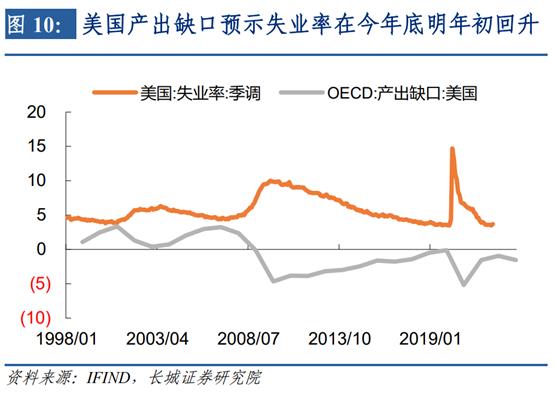 第二阶段就是发达国家失业率回升的阶段:随着欧美不断加息,发达经济体的经济进入到劳动力市场收缩阶段。我们知道,经济周期分为不同口径,最短的是库存周期,其次是朱格拉周期,最长的是康波周期。当前欧美经济体只是表现在短周期的下行,较长周期的指标:就业率还未下行。短周期的经济指标恶化并不代表经济真正进入长期衰退、通胀能够得到有效控制。在劳动力市场仍显坚韧的情况下,短周期的下行趋势结束之后,通胀很容易再次反扑。我们认为,发达国家失业率即将在四季度回升。我们仍然以美国为例,劳动力市场是美国重要的经济生产要素,其失业率的上升代表资源的闲置,产出缺口相应扩大,从历史上来看这两者高度相关。OECD预测美国的产出缺口即将在今年底明年初再次扩大,由此可以推测失业率也在此阶段回升。
