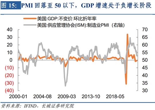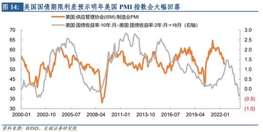 第三阶段就是经济危机阶段。历史上并不是每次经济回落都会发生经济危机,只有出现快速且大幅的回落才叫经济危机。此时GDP增速进入负增长,订单下降速度过快导致库存高企,市场恐慌导致信用利差大幅升高,股市也出现较大幅度调整。最近的美国两次经济危机就是2008年和2020年,一次是次贷危机造成的,一次是新冠疫情造成的,但表现特征几乎一致:需求收缩的速度快、幅度大。这次发达国家为何会爆发经济危机?原因在于货币政策收缩的力度过大。在短周期的经济周期中,利率走势一般领先工业需求和生产,在美国基本领先一年半左右;只有当利率波动幅度较大时,这种影响会超出短周期的范畴,在时间上和影响面上扩大。比如这一轮经济周期,美国的国债期限利差已经大幅倒挂,预示着明年PMI指数会大幅回落,类似于2008年经济危机时的表现。
