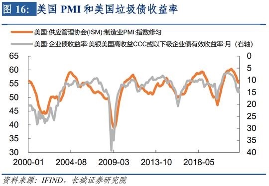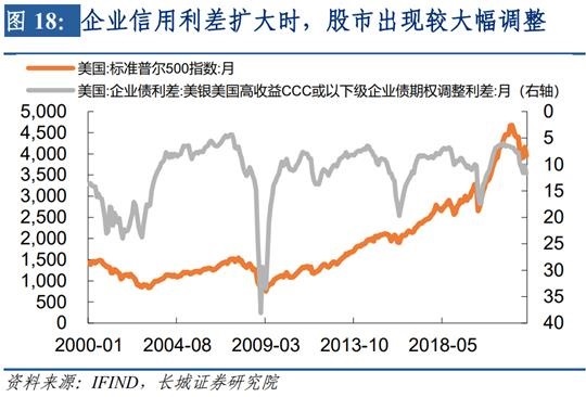 比如欧债五国中的意大利,在2011年时其国家信用大幅受损,德国-意大利的国债利差大幅缩窄至450BP左右,造成欧债危机爆发,ITLMS指数快速下跌。美国自身也同样会发生这种危机,从2000年以来的数据看,当企业信用利差扩大的时候,股票市场都会出现较大幅度调整。比如2000-2002年、2007-2008年、2015年、2020年,其中除了2015年其他几次都可以成为是经济危机。