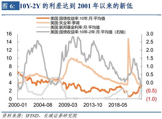 当前美国国债期限利差已经达到历史较低水平,10Y-2Y的利差达到2001年以来的新低,这反映出未来经济走势即将发生转折。并且从近20余年的历史规律来看,这一转折同时发生的是失业率的回升和降息周期的开启。但反观过去几次的历史,可以看出十年期国债利率才是重要的优先变量,其不受失业率、期限利差的影响,只有十年期国债利率上升至一定程度之后,才会促使失业率回升以及期限利差转向。