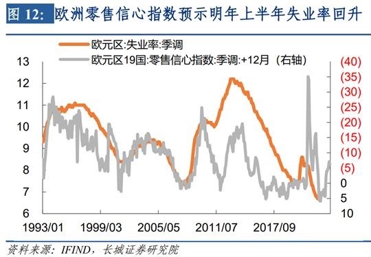 同时美国失业率与通胀预期也有高度相关的关系。从1999年以来的数据看,当美国失业率下降的时候通胀预期会上升,这反映了经济需求旺盛;反之失业率上升的时候通胀预期会下降。在最近二十年里只有2014-2019年出现过背离,这一阶段里失业率不断下降、通胀预期也持续回落。这是因为当时全球科技进入新一轮快速增长期,我们在《促长期增长,盼改革实效——宏观经济半年度报告》里有过相应阐述,较高的生产率回升促使失业率下降,通胀预期下降。当前失业率和通胀预期处于反向阶段,主要背景就是科技创新处于低速期,因此失业率的上升必然会伴随通胀预期的下降。随着美联储加息抑制通胀预期,失业率也正逐步抬升。欧洲形势也几乎相同。零售信心指数已经大幅回落,其领先失业率大概12个月,这预示着明年上半年失业率可能大幅回升。