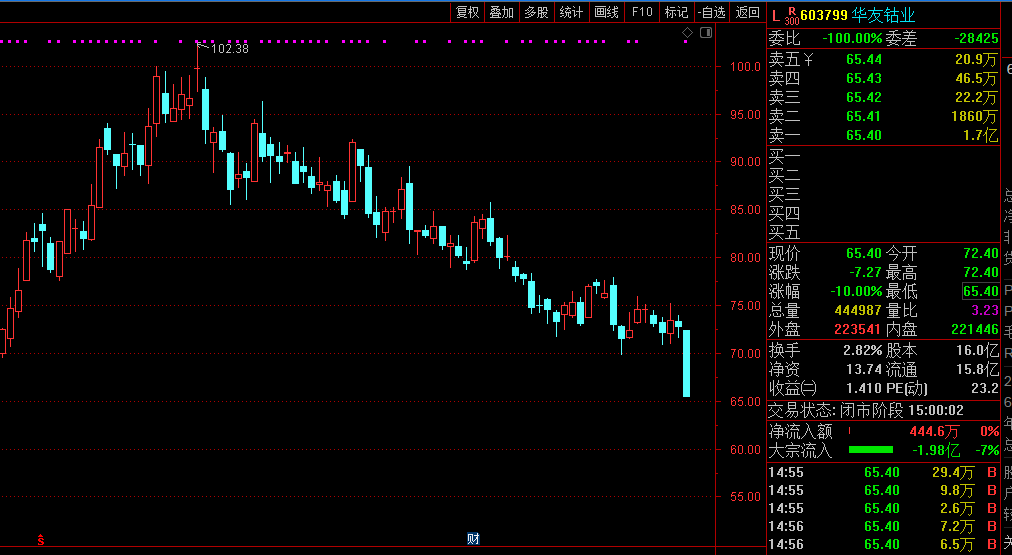 华友钴业今日低开低走,午后便封死跌停直至收盘,全天成交金额29.6亿元。