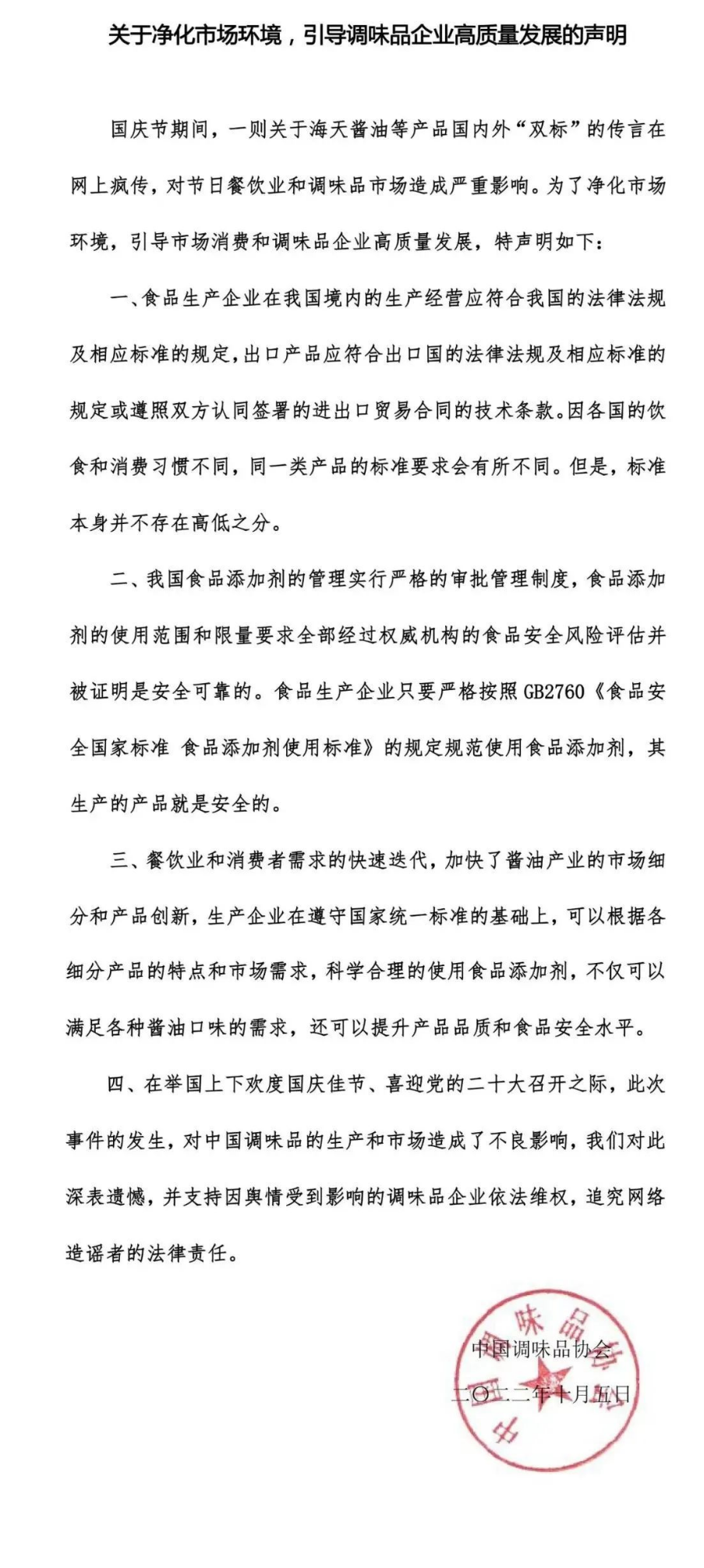 中国调味品协会发布声明称,国庆节期间,一则关于海天酱油等产品国内外“双标”的传言在网上疯传,对节日餐饮业和调味品市场造成严重影响。此次事件的发生,对中国调味品的生产和市场造成了不良影响,我们对此深表遗憾,并支持因舆情受到影响的调味品企业依法维权,追究网络造谣者的法律责任。