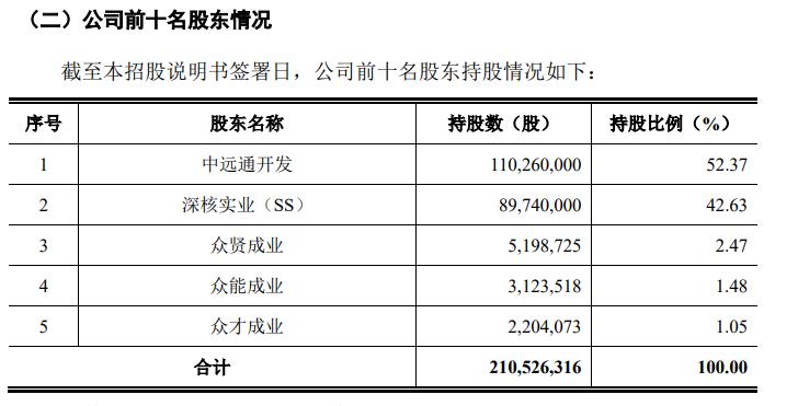 披露显示,中国广核集团、吉学龙和张学军为中远通的实际控制人,合计控制中远通98.52%的股份,股权比较集中。众贤成业、众能成业、众才成业等员工持股平台,也持有部分股份。在公布招股书之前,中远通并未引入外部投资人。
