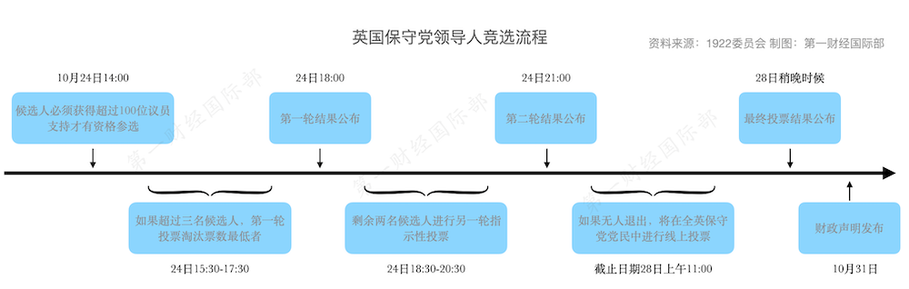 若当天的投票后,最后一轮的两位候选人中无人选择主动退出,则将由数十万名保守党党员进行选择。为了加快速度,投票将在线上进行。该线上投票将于10月28日上午11点结束,结果将在同一天晚些时候公布。