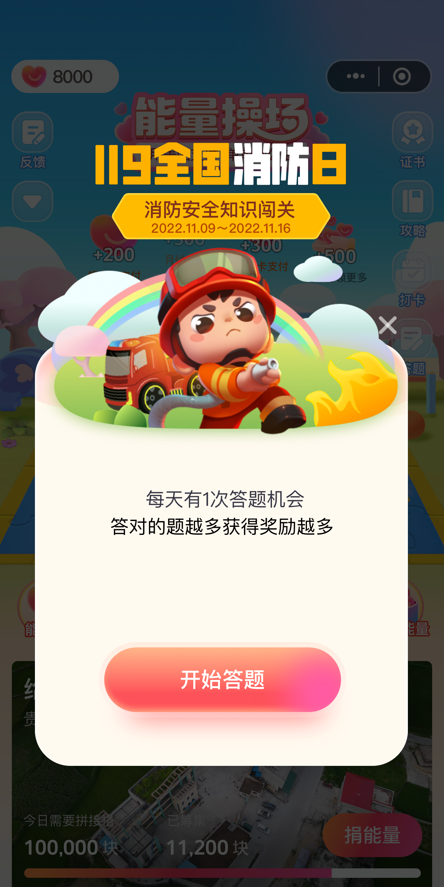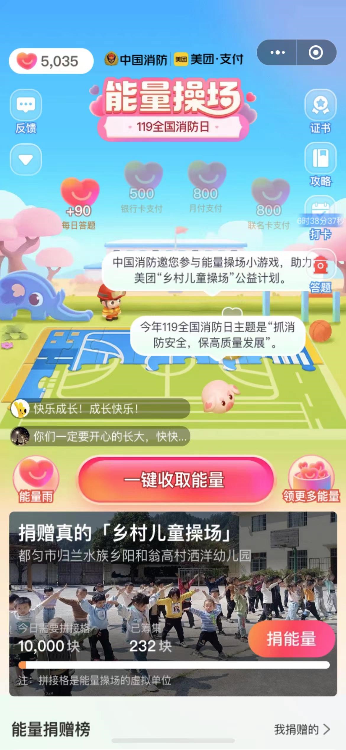 通过参与能量操场小游戏中的消防知识问答便可获得能量。游戏结束后,美团和中国消防会一起在贵州为乡村儿童建造线下的“乡村儿童操场”。