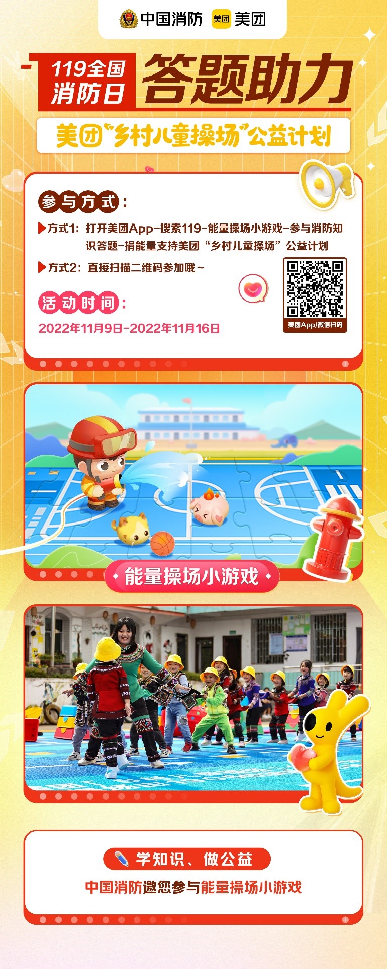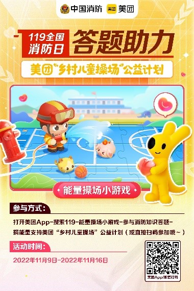 参与方式:打开美团App-搜索119-能量操场小游戏-参与消防知识答题-捐能量支持美团“乡村儿童操场”公益计划或直接扫码参加。