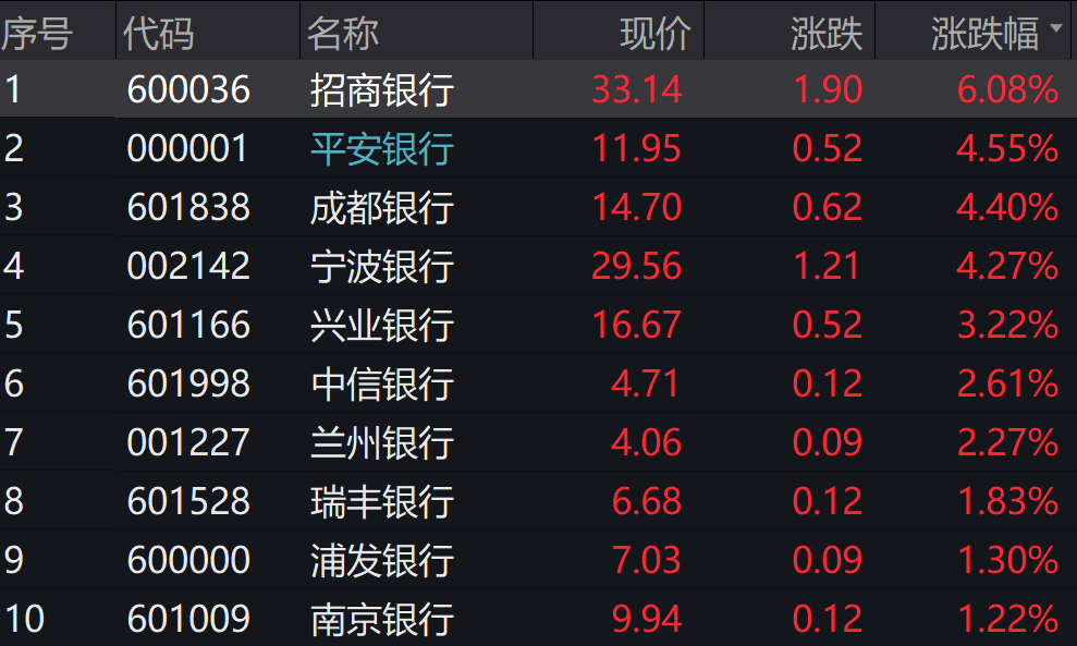 个股方面,当日有近九成银行股收涨,招商银行、平安银行、成都银行、宁波银行领涨,分别上涨6.08%、4.55%、4.40%和4.27%;同时,涨幅超过2%的还有兴业银行、中信银行和兰州银行,分别上涨3.22%、2.61%和2.27%。