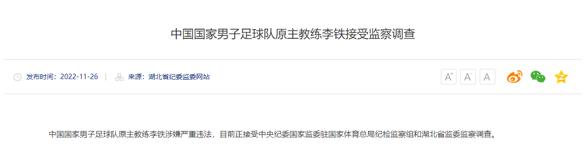 11月26日,湖北省纪委监委网站消息,中国国家男子足球队原主教练李铁涉嫌严重违法,目前正接受中央纪委国家监委驻国家体育总局纪检监察组和湖北省监委监察调查。