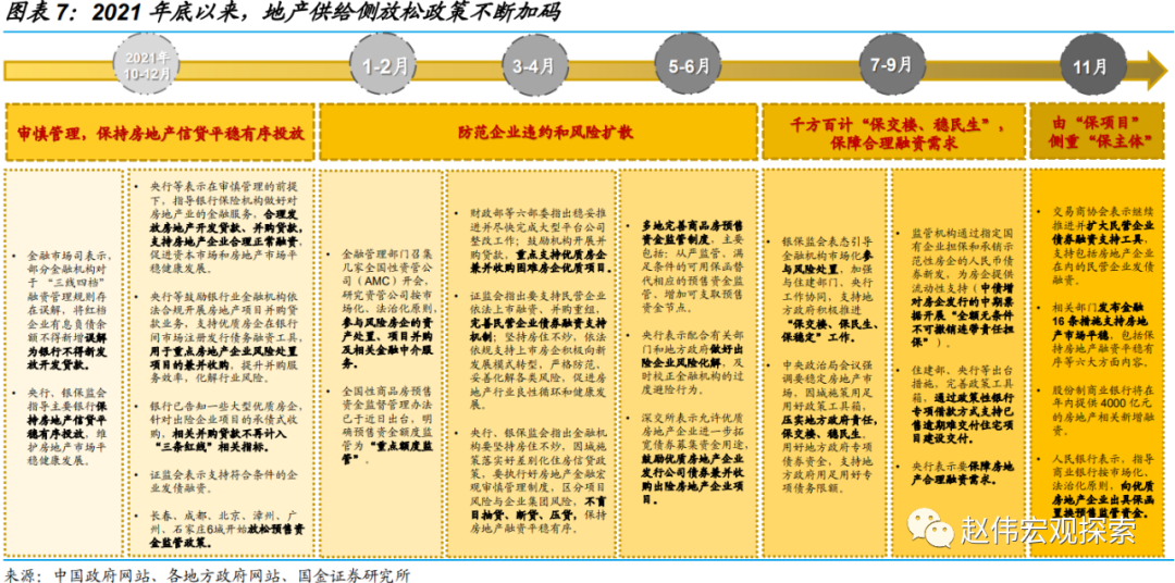 供给政策从“保交楼”再到“保交楼、保主体”并驱,支持力度不断加强。去年年底,监管强调“保持信贷平稳有序投放”,标志供给政策开始出台。7月供给政策转向“保交楼”,8月推出2000亿元政策性银行专项借款,郑州、湖北等地成立纾困基金,11月央行向商业银行提供2000亿元免息再贷款。9月开始,供给政策对“保主体”的支持力度加大;信贷方面,截至11月下旬,六大国有行对房企总授信额度超1.2万亿元、规模较央行提供的2000亿再贷款提高6倍;债券方面,5月以来,多家民企通过融资增信等方式发行债券。