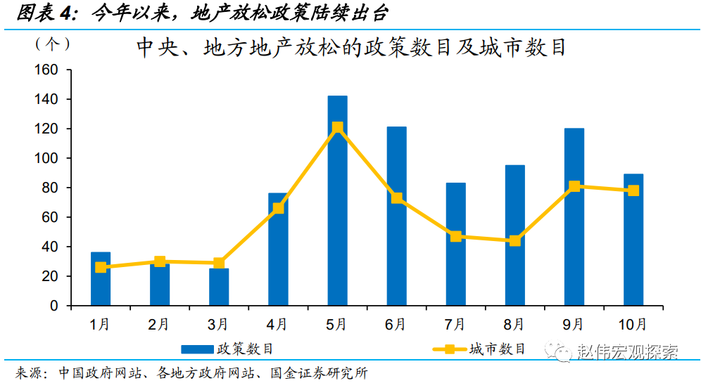 今年1月地产需求政策开始出台并加码,早期以中低能级城市为主,8月开始,部委、高能级城市政策出台明显增多。今年以来,多地出台地产需求放松政策、放松力度不断加码,三季度中央地方出台政策数合计达一季度的3.3倍。一方面,放松城市能级不断提高,由北海、菏泽、赣州等中低能级城市向郑州、南京、天津等中高能级城市转移,9月部委开始出台包括公积金利率下调、放宽首套房利率、换房退税等一系列政策;另一方面,放松措施不断升级,由购房补贴等鼓励措施转向放松限购限贷、调整首付比例、下调住房贷款利率。