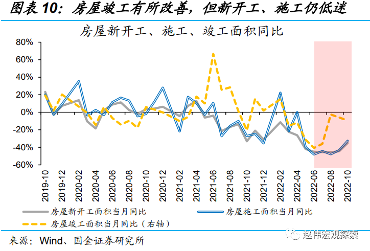7月底“保交楼”持续推进下,竣工情况率先改善、但拿地、开工延续低迷。8月开始,全国房屋竣工有所改善,8-10月竣工面积平均同比较7月提升30个百分点至-6%、明显好于房屋新开工的平均同比-41.7%、施工面积平均同比-41.2%。同时,房企融资、购房需求未有效改善,极大影响房企投资能力及意愿,8-10月房地产开发投资平均同比下降13.5%;房企拿地意愿消极,土地成交持续大幅回落,10月土地购置面积同比回落53%、土地成交价款同比回落50%。