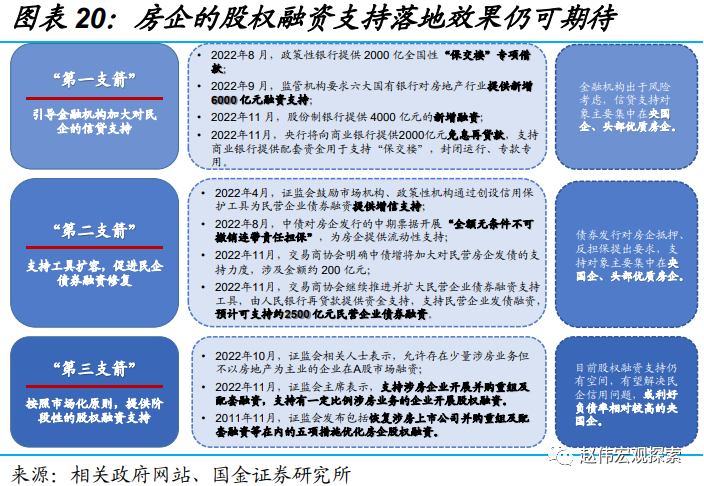 已有的信贷、债券融资支持或难完全解决民企融资难的问题,“第三支箭”开始落地、支持效果待跟踪。目前民营房企普遍难以满足信贷、债券融资支持在资产负债、抵押品等方面的要求,直接约束政策效果;比如:代表银行地产不良贷款率持续攀升、平均由2020年12月的0.6%提升至2022年6月的2.7%,因此“第一支箭”引导金融机构加大对房企信贷支持的对象更多集中在央国企和头部优质民企,对其他民房支持力度较小。11月28日,证监会出台调整优化房企股权融资5项措施,股权融资支持有助于解决部分民企因信用不足导致的融资困难问题。
