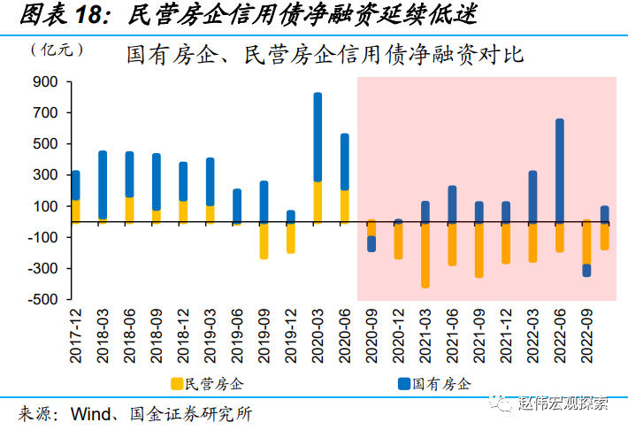 供给政策效果不佳的核心原因在于民营房企融资问题仍待解决,针对民企的融资支持政策仍需关注。民企在地产销售中份额占比大,去年1-8月,商品房累计销售面积11.4万亿平方米,其中民企销售占比达66%,而今年同期累计销售面积回落23%,其中民企销售回落38.2%、成为主要拖累。目前地产低迷的核心桎梏在于房企现金流断裂,而信贷、债券融资支持措施出台以来,民营房企融资并未有起色,5月至10月民营房企债券净融资月平均-91亿元、低于1-4月的-75亿元,未来民营房企融资仍需要持续性政策扶持。