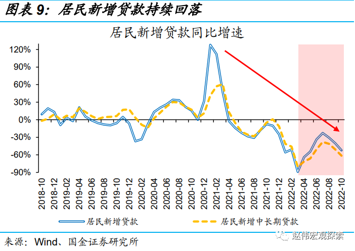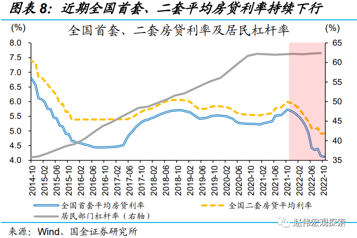 需求政策加码下,住房贷款利率持续下行,但居民贷款意愿不强,地产销售延续低迷。需求放松力度不断加强下,2021年10月起,全国房贷利率明显下行、首套房平均利率由去年10月的5.73%回落1.58个百分点至今年10月的4.12%,二套房平均利率由5.99%回落1.08个百分点至4.91%;但居民贷款意愿依旧低迷,居民部门新增贷款延续回落、其中10月居民新增中长期贷款3月平均同比回落61.4%、低于总新增贷款3月平均同比9.1个百分点。对应地产销售延续低迷,10月商品房销售同比回落23.2%。
