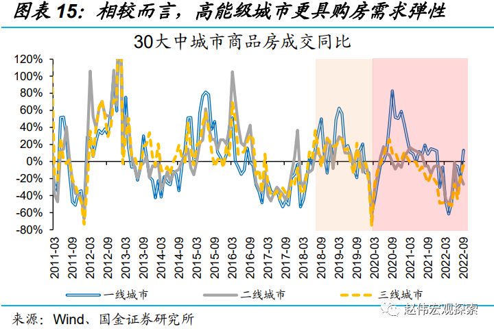 高能级城市需求仍有释放空间,其地产回暖对低能级城市的传导带动值得关注。目前低能级城市地产政策应出尽出、购房限制较小,但由于购房需求透支、人口流出等因素限制,地产销售延续低迷;相较而言,高能级城市在地产恢复过程中更具需求弹性,比如2020年2月至9月,一线城市商品房成交同比提升144个百分点,明显好于二线、三线城市的65、85个百分点;但由于地产市场信心低迷、收入预期走弱、居民杠杆约束等因素,高能级城市地产销售疲软;11月沪京杭蓉等热点城市“四限”局部松绑,但政策力度较为有限。