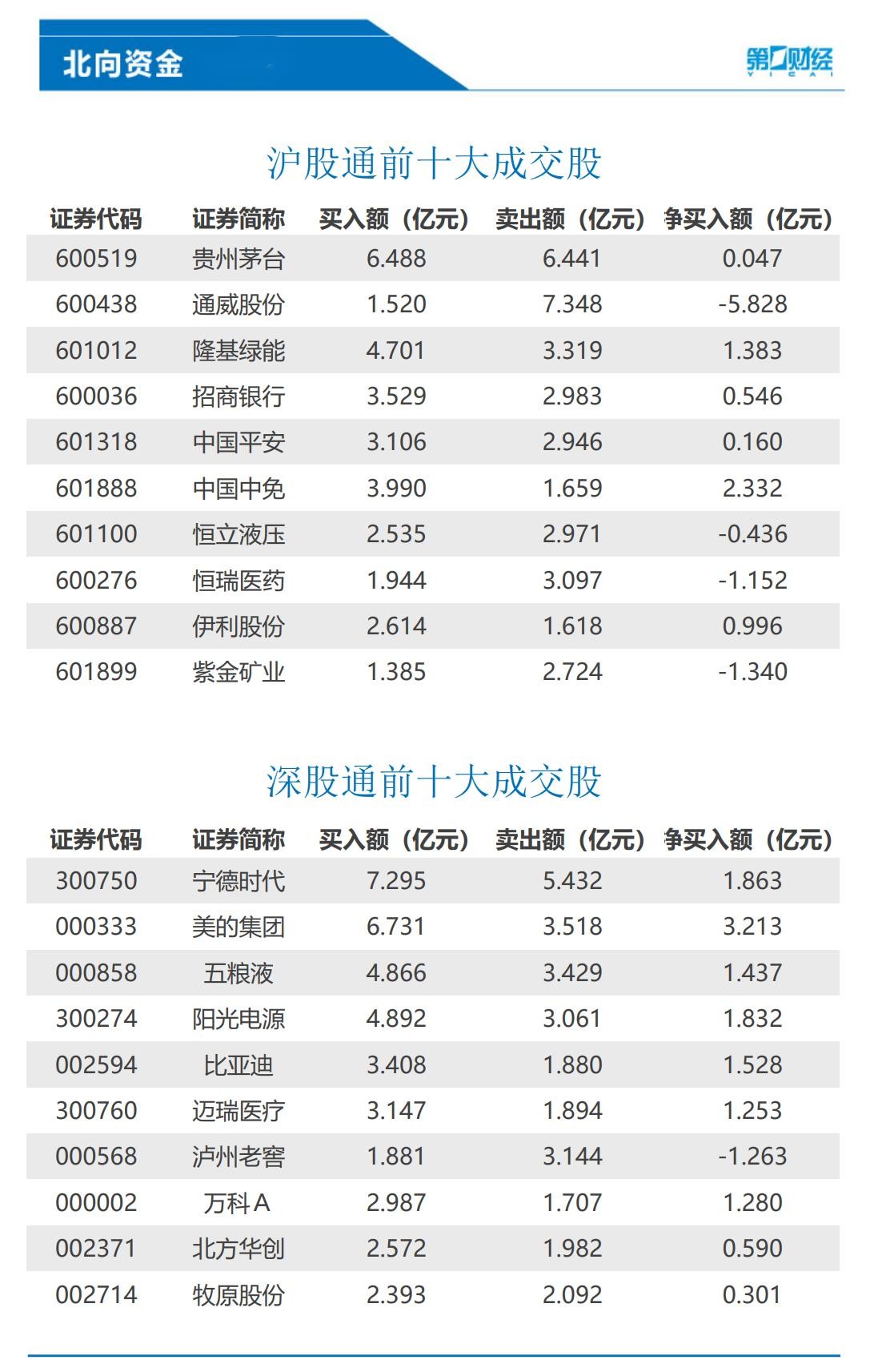 12月13日,北向资金全天净卖出9.47亿元;其中,沪股通净卖出11.36亿元,深股通净买入1.89亿元。前十大成交股中,净买入额居前三的是美的集团、中国中免、宁德时代;净卖出额居前三的是通威股份、紫金矿业、泸州老窖。