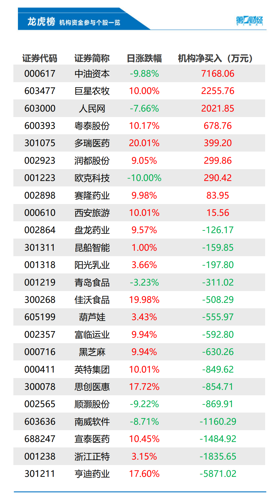 盘后数据显示,12月13日龙虎榜中,共24只个股出现了机构的身影,有9只股票呈现机构净买入,15只股票呈现机构净卖出。当天机构净买入前三的股票分别是中油资本、巨星农牧、人民网;当天机构净卖出前三的股票分别是亨迪药业、浙江正特、宣泰医药。