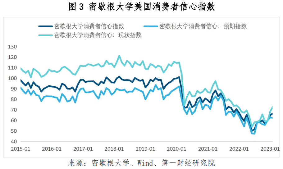 随着美国通胀压力缓和,美国消费者信心明显恢复。根据密歇根大学的数据,2月美国消费者信心指数为66.4,已经连续第三个月回升。消费者对于经济现状的看法更加乐观,2月消费者信心现状指数为72.6,刷新2022年以来的高点;预期指数虽然环比下降0.4至62.3,但仍处于过去1年来的高位。