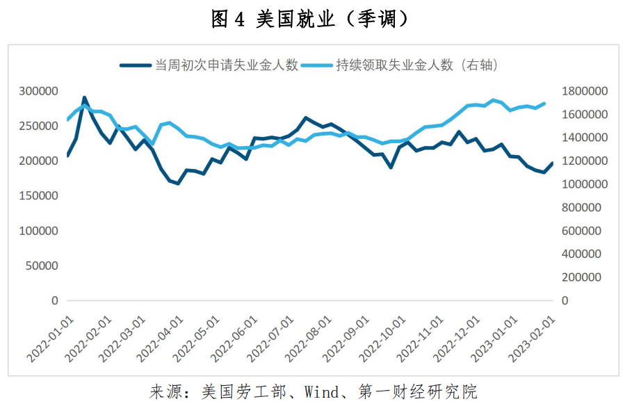 美国劳工部的数据显示,截至2月4日当周,美国首次申请失业金人数为19.6万人,创下4周新高,环比增长1.3万。持续申请失业金人数自去年11月下旬以来维持在160-170万之间,截至1月28日当周该数据录得168.8万人,仍低于疫情前2019年的平均水平(170万),显示出美国就业市场的强劲。