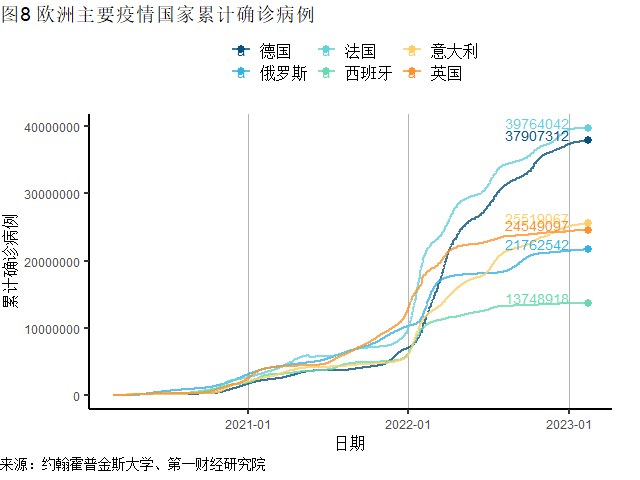 上周欧洲发达国家新增确诊22.2万例,维持在两年多来的低位。欧洲主要发达国家中,上周德国(新增8.5万例)、英国(新增2.2万例)新增确诊病例仍在增加,其中德国新增病例已经连续3周上升;意大利(新增3.1万例)、法国(新增2.3万例)、西班牙(新增0.8万例)新增病例延续了下降趋势。上周俄罗斯新增确诊7.5万例,创17周新高,较前一周环比增长30%。