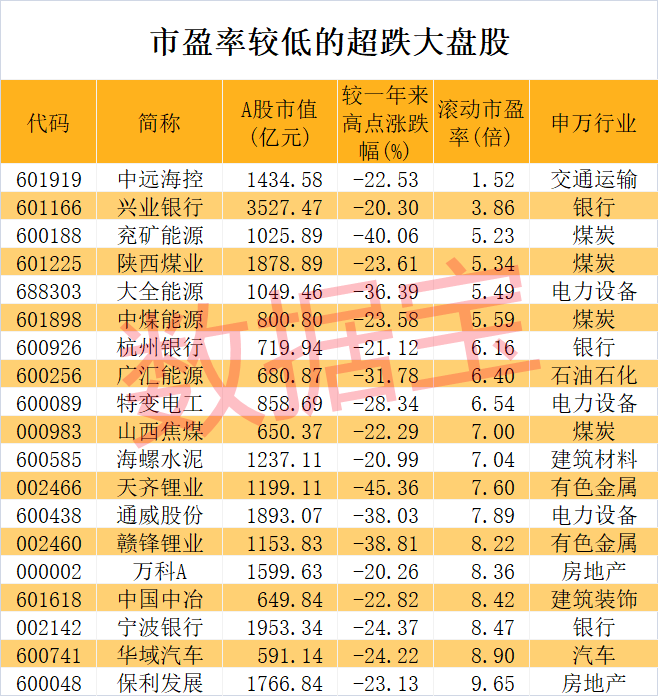 从估值水平来看,上述个股近一半市盈率不到10倍。中远海控滚动市盈率1.52倍排在最低,公司是国内海运龙头,去年前三季度净利润逼近千亿元。2021年7月份该股创下历史高点,迄今回撤幅度接近45%。市盈率较低的还有兴业银行、兖矿能源、陕西煤业、大全能源、中煤能源等。(数据宝)
