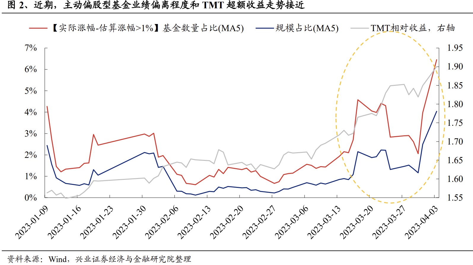 根据兴业证券经济与金融研究院所统计的基金业绩偏离度数据显示,近期主动偏股型基金或正在加速向TMT板块调仓。