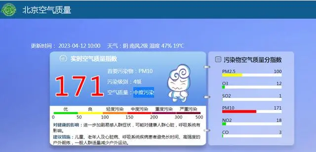 据北京市生态环境监测中心发布本市实时空气质量指数,受外来沙尘影响,4月12日10时,空气中首要污染物为PM10,污染级别4级,达到中度污染水平。