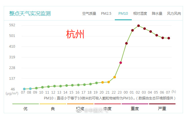 据@中国天气微博消息,沙尘影响已经南下抵达上海、杭州,昨天夜间上海pm10浓度急剧升高,今晨在东风作用下已有所下降,杭州pm10浓度则是从今天凌晨开始明显上升,目前维持较高水平。目前在河南、山东、河北南部、安徽中北部等地pm10浓度仍较高。
