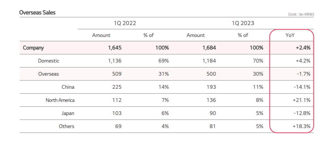 LG生活健康2022和2023一季度海外销售额对比