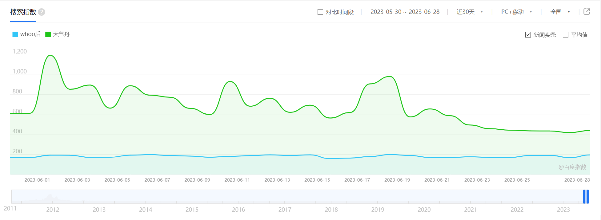 “Whoo后”与“天气丹”的百度搜索指数