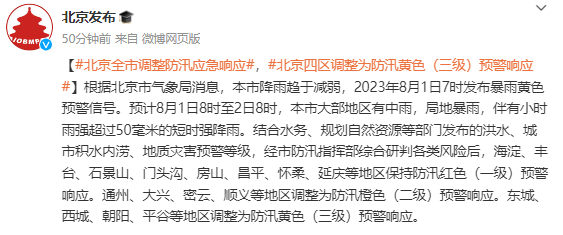 根据北京市气象局消息,本市降雨趋于减弱,2023年8月1日7时发布暴雨黄色预警信号。预计8月1日8时至2日8时,本市大部地区有中雨,局地暴雨,伴有小时雨强超过50毫米的短时强降雨。结合水务、规划自然资源等部门发布的洪水、城市积水内涝、地质灾害预警等级,经市防汛指挥部综合研判各类风险后,海淀、丰台、石景山、门头沟、房山、昌平、怀柔、延庆等地区保持防汛红色(一级)预警响应。通州、大兴、密云、顺义等地区调整为防汛橙色(二级)预警响应。东城、西城、朝阳、平谷等地区调整为防汛黄色(三级)预警响应。