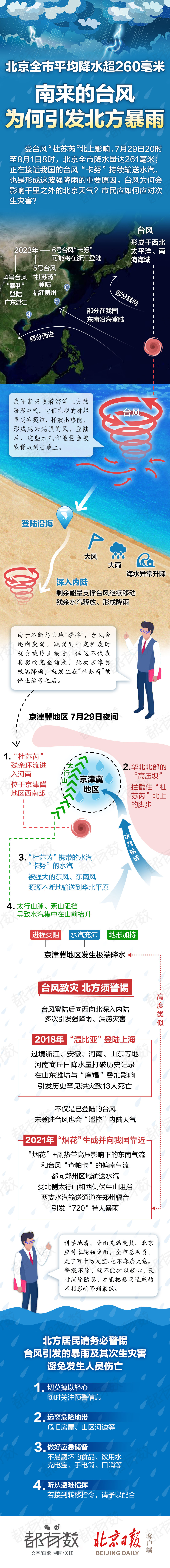 据北京日报,受台风“杜苏芮”北上影响,7月29日20时至8月1日8时,北京全市降水量达261毫米;正在接近我国的台风“卡努”持续输送水汽,也是形成这波强降雨的重要原因。台风为何会影响千里之外的北京天气?市民应如何应对次生灾害?