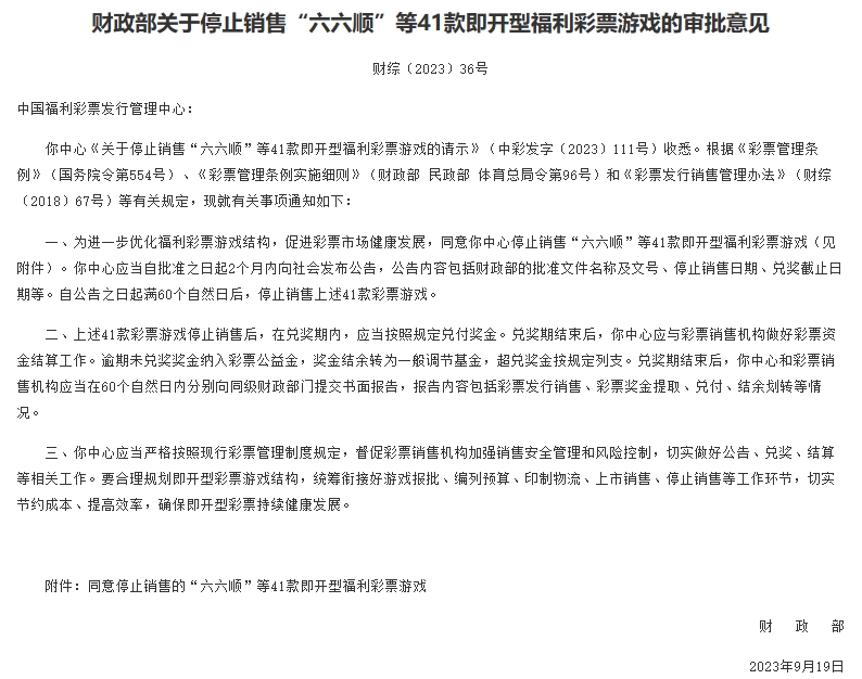 据财政部网站11日消息,为进一步优化福利彩票游戏结构,促进彩票市场健康发展,财政部同意中国福利彩票发行管理中心停止销售“六六顺”等41款即开型福利彩票游戏。