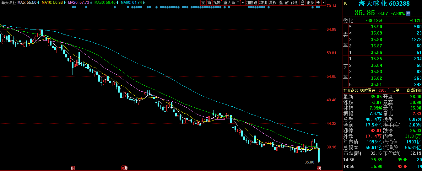 10月16日,海天味业今日跌7.89%,报35.85元,成交额17.54亿元,换手率0.87%。