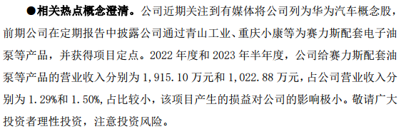 圣龙股份表示,公司近期关注到有媒体将公司列为华为汽车概念股, 前期公司在定期报告中披露公司通过青山工业、重庆小康等为赛力斯配套电子油泵等产品,并获得项目定点。2022年度和2023年半年度,公司给赛力斯配套油泵等产品的营业收入分别为1915.10万元和1022.88万元,占公司营业收入分别为1.29%和1.50%,占比较小,该项目产生的损益对公司的影响极小。敬请广大投资者理性投资,注意投资风险。