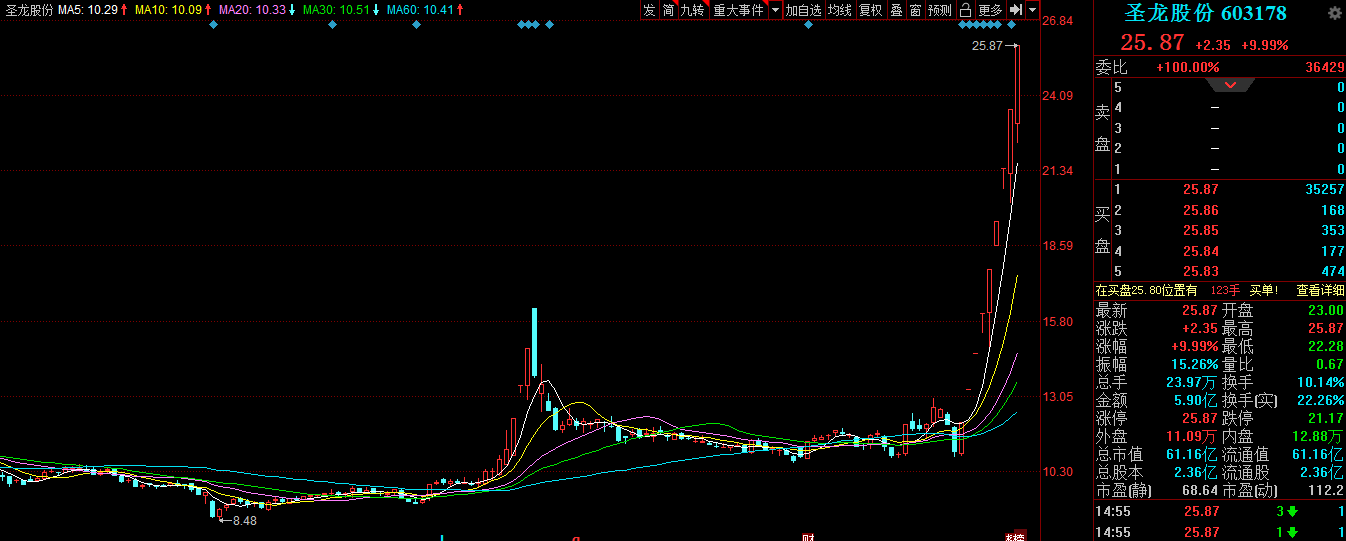 盘面上,截至今日收盘,圣龙股份涨停,报25.87元,成交额5.9亿元。