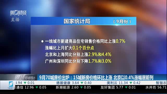10月19日,国家统计局发布9月份70个大中城市商品住宅销售价格变动情况。据国家统计局城市司高级统计师沈赟介绍,一线城市新建商品住宅销售价格环比持平、同比涨幅扩大,二手住宅环比转涨、同比降幅收窄;二、三线城市商品住宅销售价格环比下降、同比有涨有降。